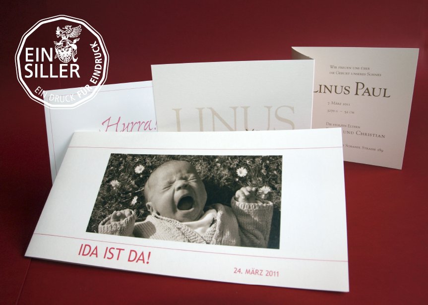 Einblick in die Entwicklung geben – Geburtsanzeigen, Sponsionen, Jubiläen, Feiern, etc. Individuell oder nach Wunsch gestaltete Drucksorten, aber auch ein breites Sortiment an Standard-Drucksorten stehen für einschneidende Ereignisse bereit. Muster können im Büro oder zu Hause berücksichtigt werden. Nutzen sie unser Katalogverleihservice, Reservierung per Email oder telefonisch.
